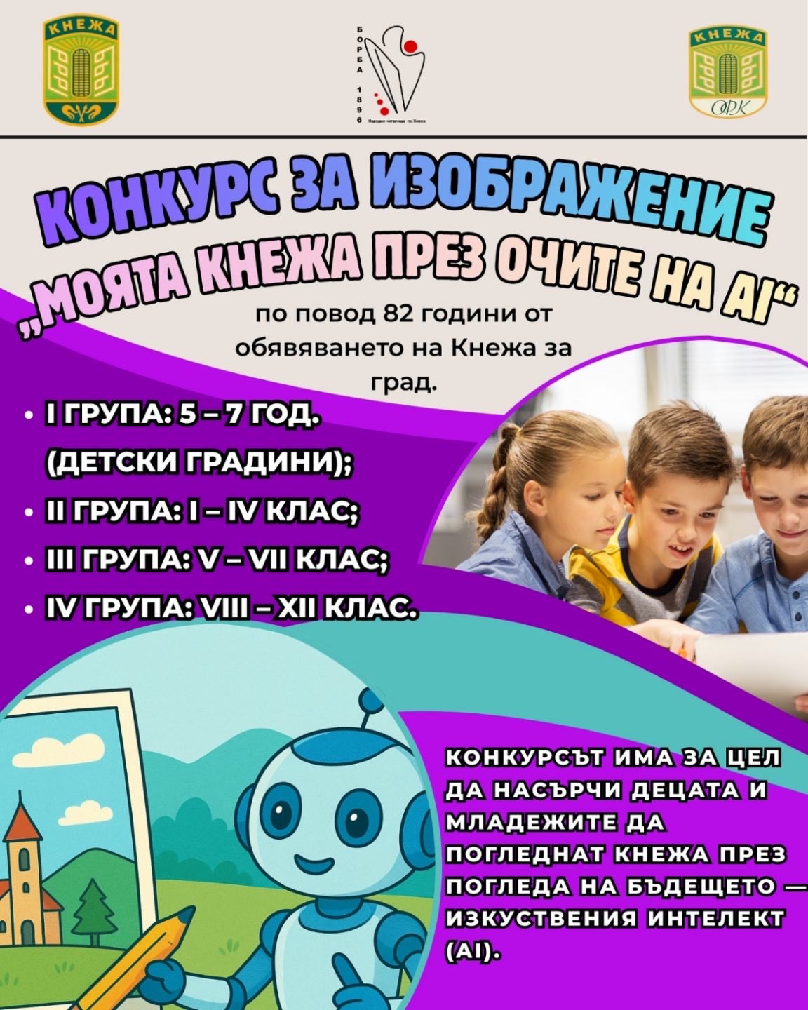 КОНКУРС ЗА ИЗОБРАЖЕНИЯ „МОЯТА КНЕЖА ПРЕЗ ОЧИТЕ НА AI“ се организира от Общински фонд „Култура“ и НЧ „Борба–1896“ по повод 82 години от обявяването на Кнежа за град.